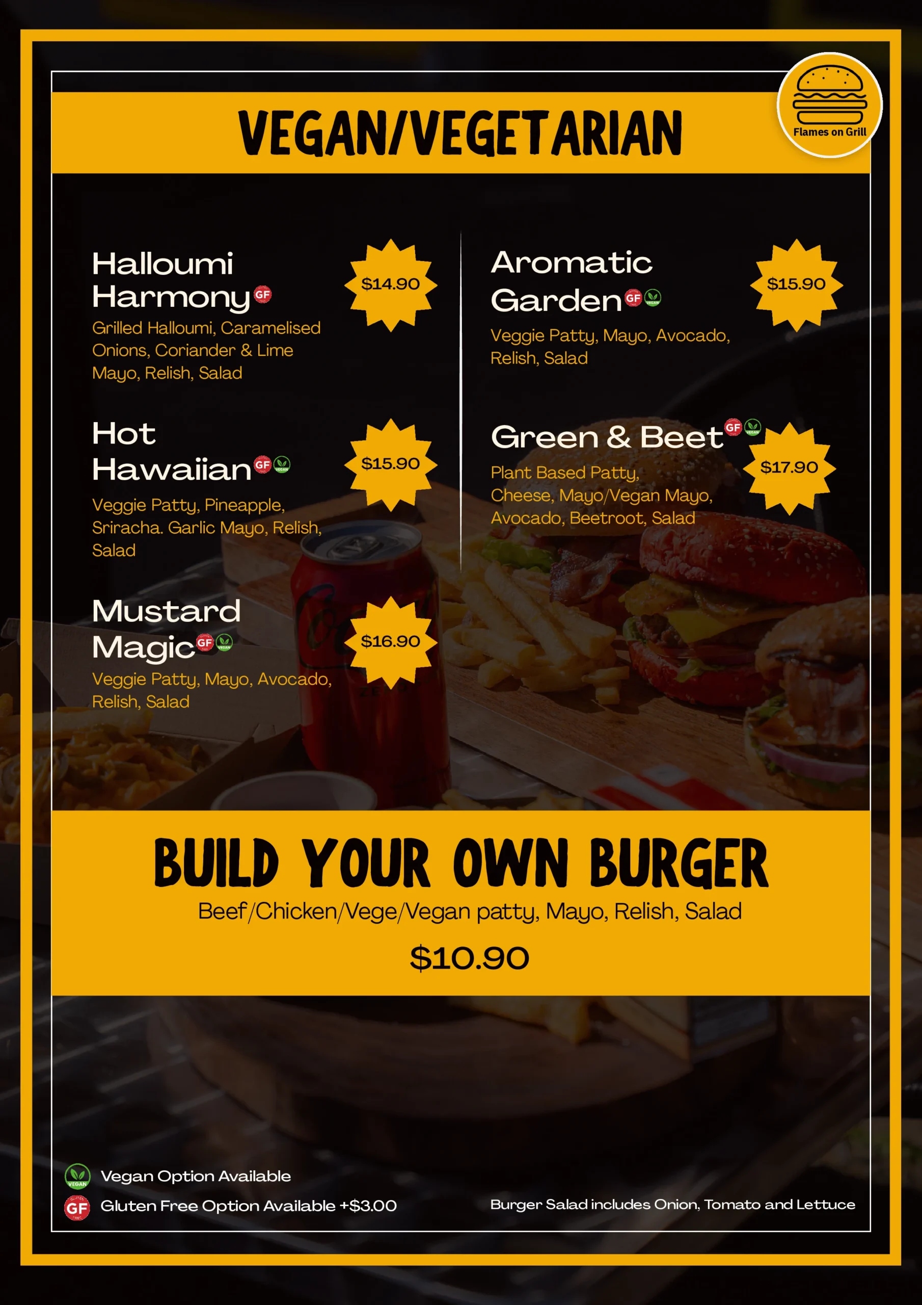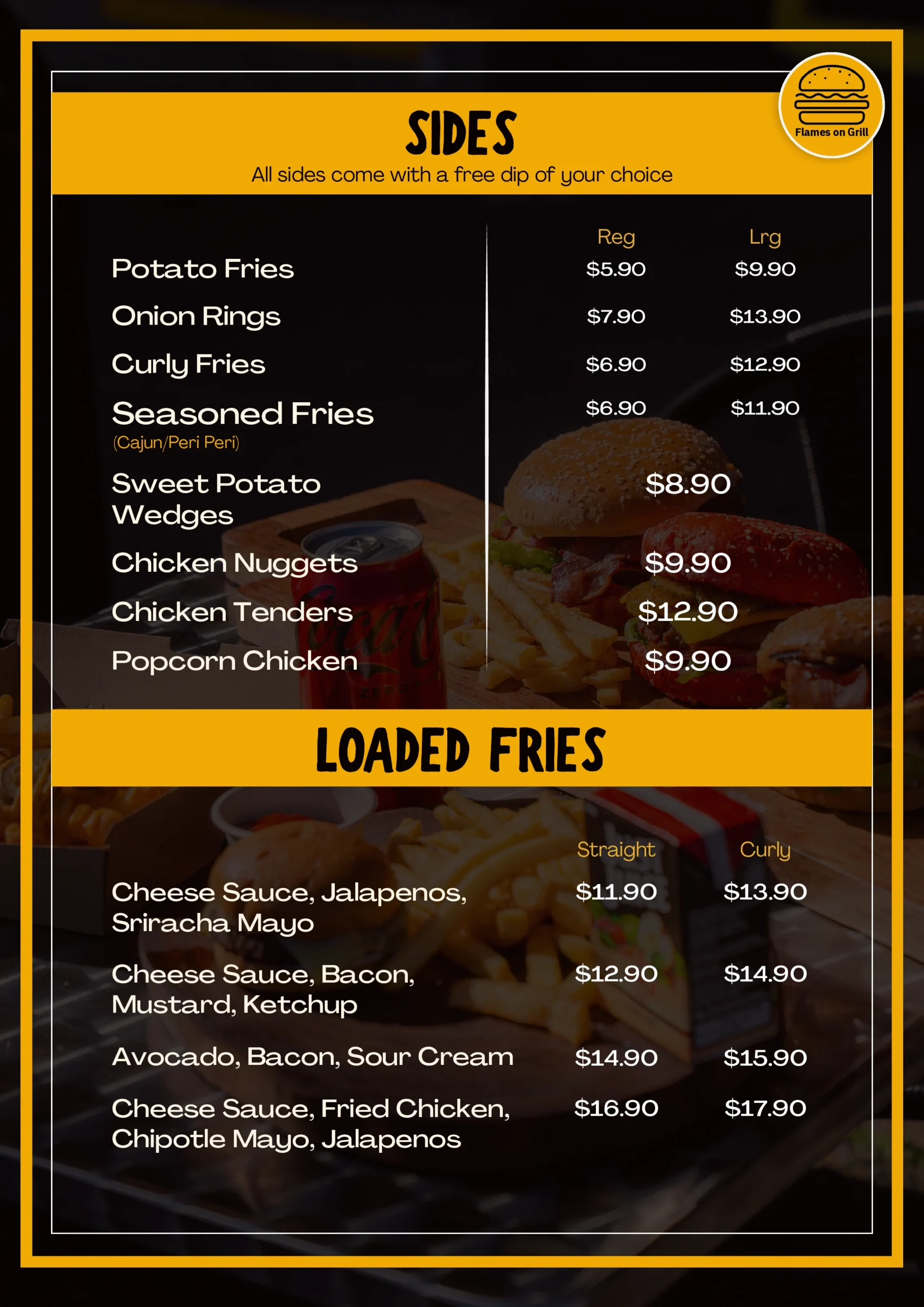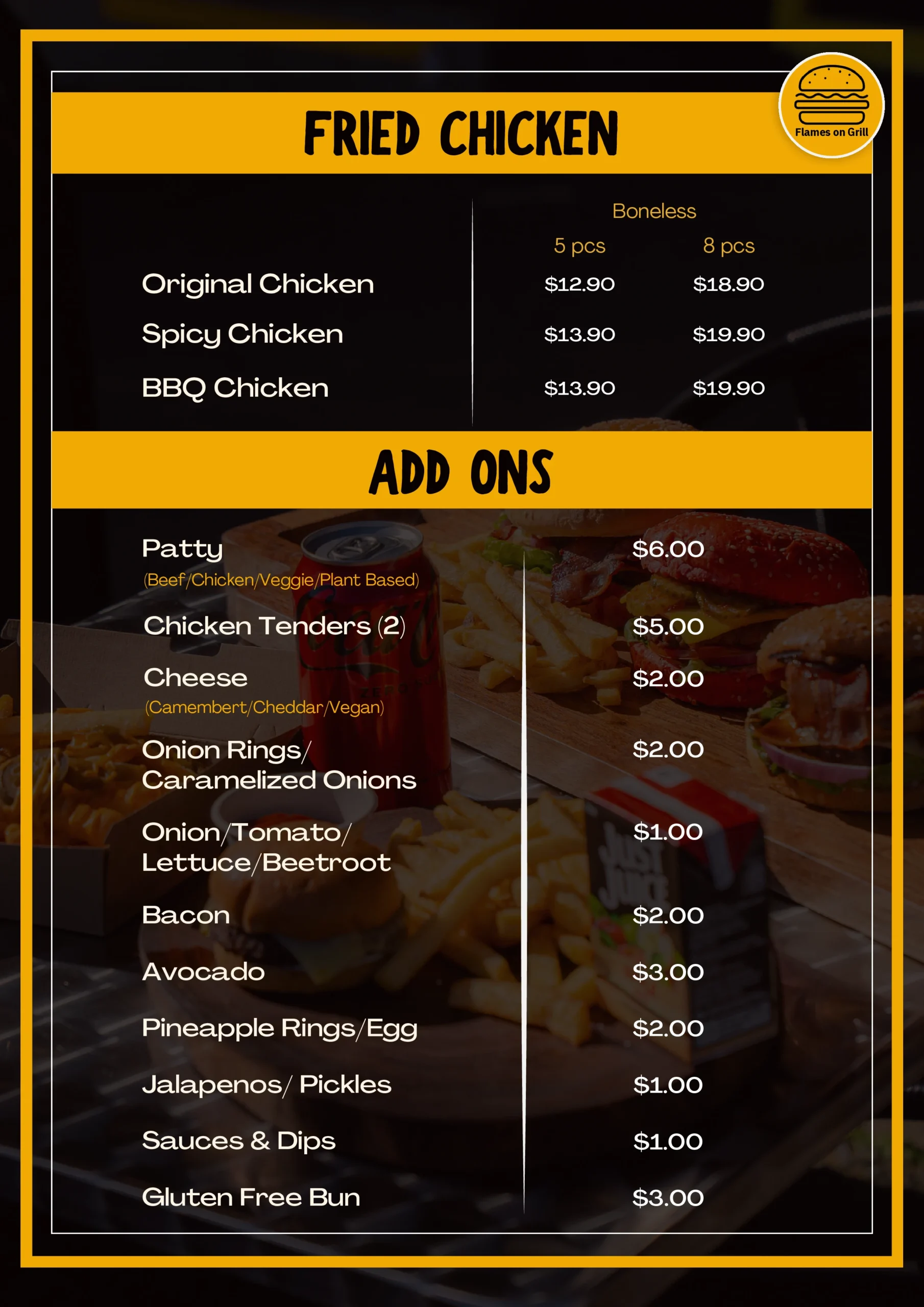 Please be aware that Flames on Grill prepares food and uses ingredients that may contain or come into contact with nuts or lupine, wheat/gluten, milk, eggs, fish, shellfish, soy, and sulphites. Customers with food allergies should exercise caution when consuming our products.